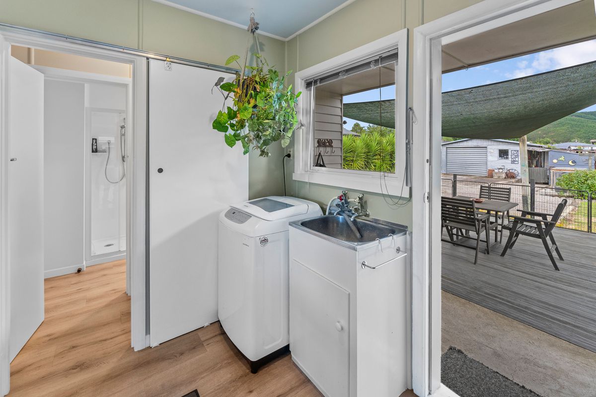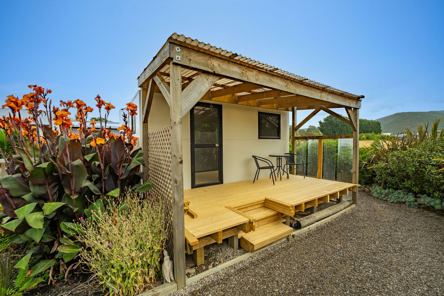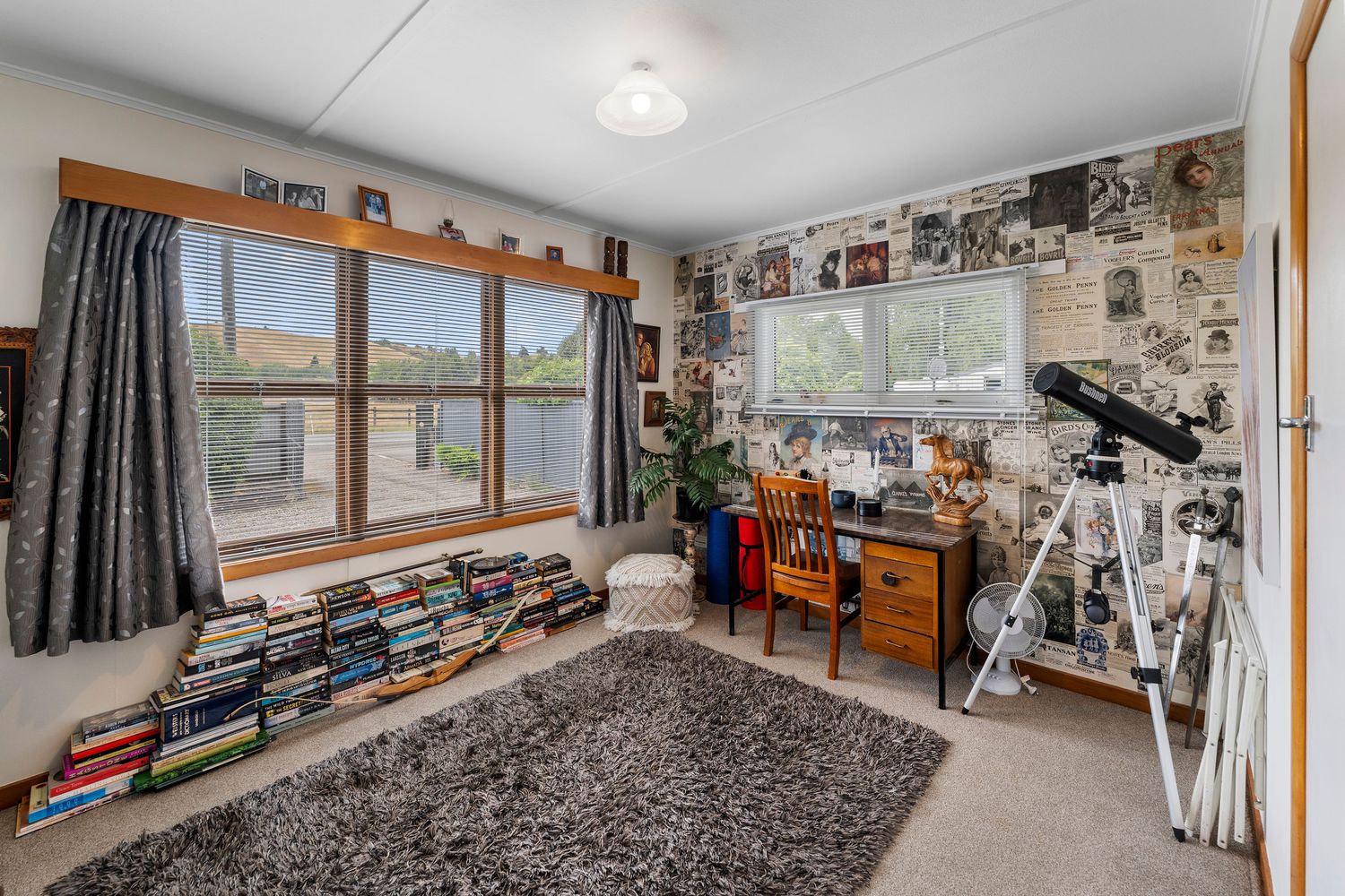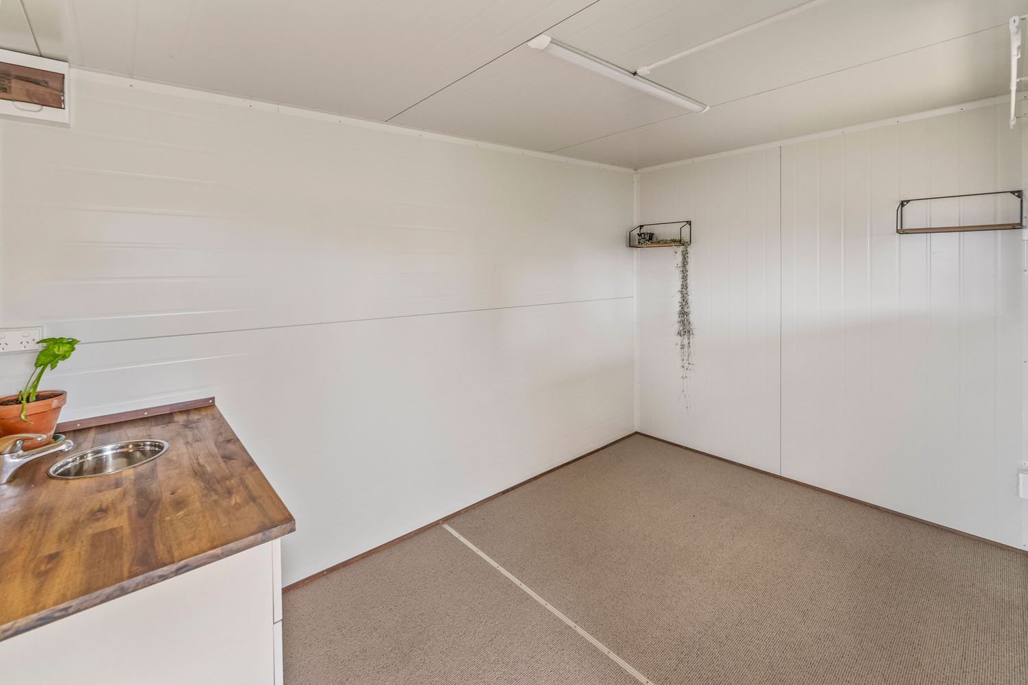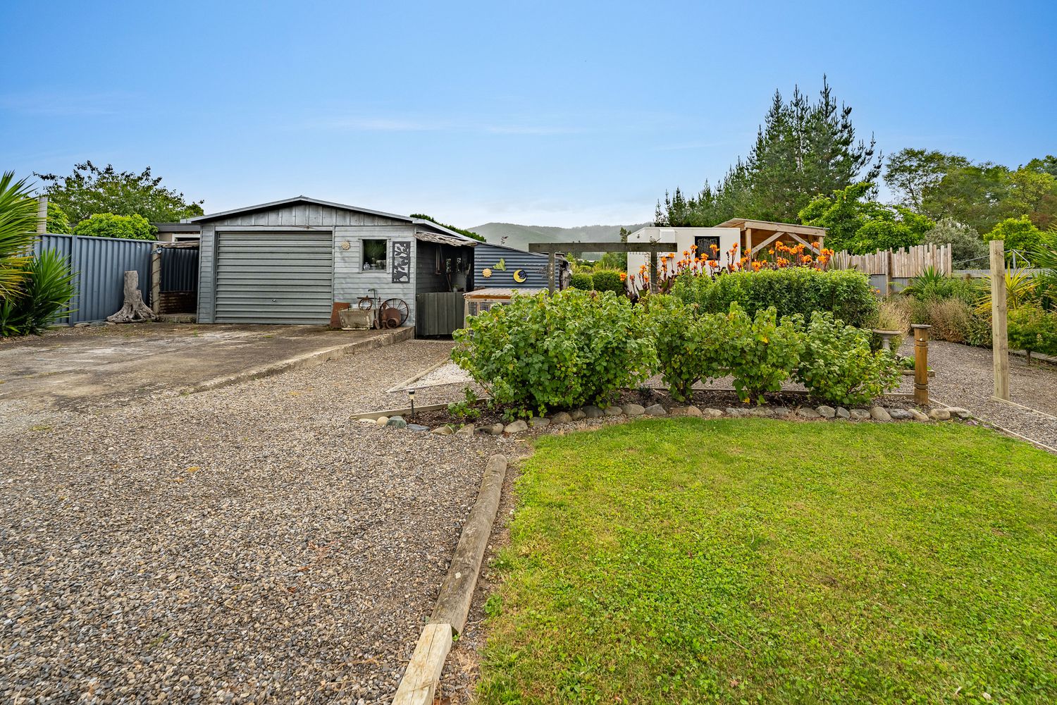 The current owner has spent the last 6 years making improvements to this solidly built weatherboard home, but now it is time for her to downsize. Starting at the front of the quarter acre section, there is ample off street parking for several vehicles, including your campervan or caravan, to complement the extra large single garage further down the section. The 3 bedroom home is partially double glazed, has been insulated underfloor, in the ceiling and in some exterior walls, and has new flooring. The interior and exterior paint has also been refreshed so you don't need to do it! The heating options are your choice of logburner and heatpump, and in summer just open the back door to the deck and sit in the shade of the sail. The rear of the section backs on to rural land, and holds many surprises, starting with a hobby room at the back of the garage. There is also a relocatable studio ( photos 15, 16, 17 ) that offers many options.